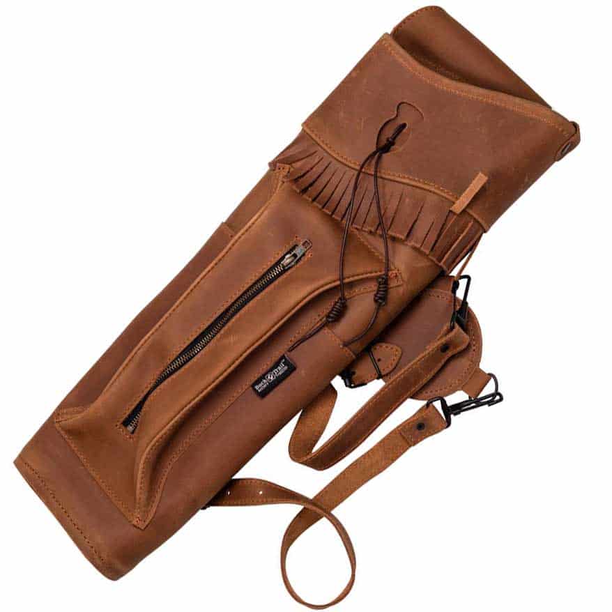 Carquois pour droitiers uniquement. A moins d’être retravaillé, ce carquois n’est pas fait pour monter à cheval 🙂